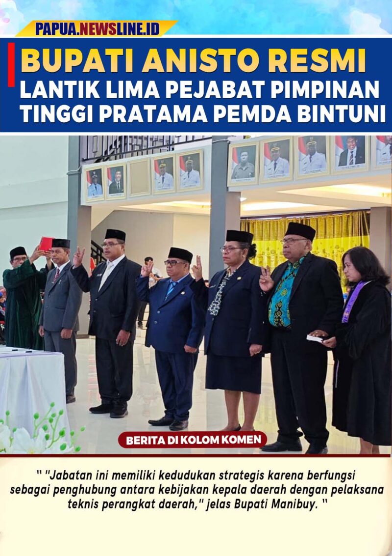 BINTUNI, newsline.id – Bupati Teluk Bintuni, Yohanis Manibuy melantik lima Pejabat Pimpinan Tinggi Pratama lingkup Pemerintah Kabupaten Teluk Bintuni. Seremonial Pelantikan dilaksanakan di Gedung Sasana Karya Kantor Bupati SP 3, Teluk Bintuni, Papua Barat, Jumat (17/4/2026).