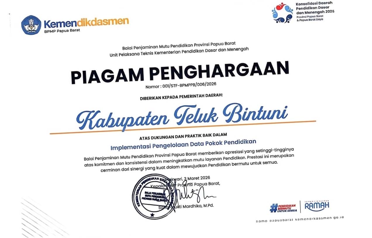 Piagam penghargaan nomor 001/STF-BPMPPB/006/2026 ini, ditandatangani oleh S. Mukti Mahardhika selaku Kepala UPT BPMP Papua Barat dan diserahkan pada saat Rapat Koordinasi Pendidikan se-Papua Barat dan Papua Barat Daya di Sorong, Senin (9/3/2026).
