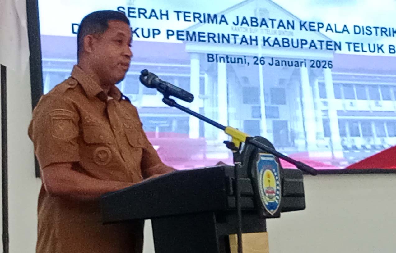 BINTUNI, newsline.id – Bupati Teluk Bintuni, Yohanis Manibuy di damping Wakil Bupati, Joko Lingara hadiri acara Serah Terima Jabatan Kepala Distrik Lingkup Pemerintah Kabupaten Teluk Bintuni, yang berlangsung di Gedung Sasana Karya Kantor Bupati Teluk Bintuni, Senin,(26/01/2026).